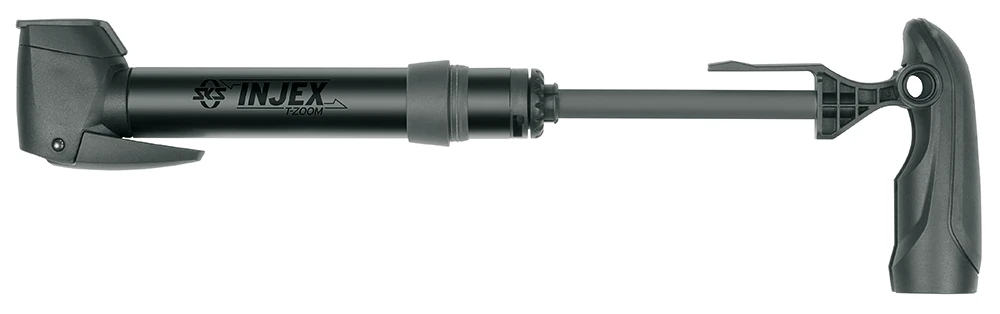 Die SKS Alu-Kompaktpumpe INJEX T-ZOOM mit universellem MULTIVALVE-Ventilanschluss ĂĽberzeugt durch die integrierte Teleskop-Funktion. Die Pumpe ist mit einem ergonomischen 2-Komponenten Klapp-T-Griff ausgestattet und liegt gut in der Hand. Weitere Features sind die zuschaltbare Hochdruckstufe bis zu 10 bar und der Klemmhebel fĂĽr eine sichere Ventilverbindung. Dank des 2 Punkt-Pumpenhalters kann die Luftpumpe unter oder anstelle eines Flaschenhalters befestigt werden.